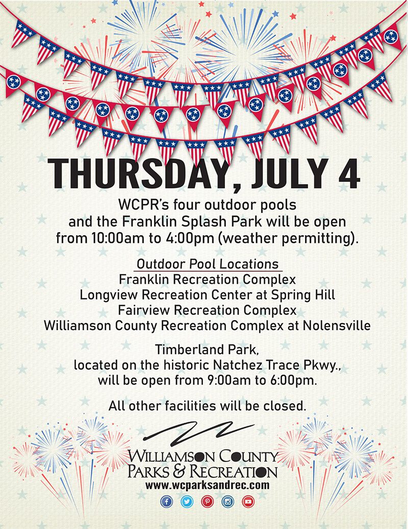 Williamson County Parks and Recreation’s four outdoor pools and Splash Park (Franklin) will be open on Independence Day, Thursday, July ...