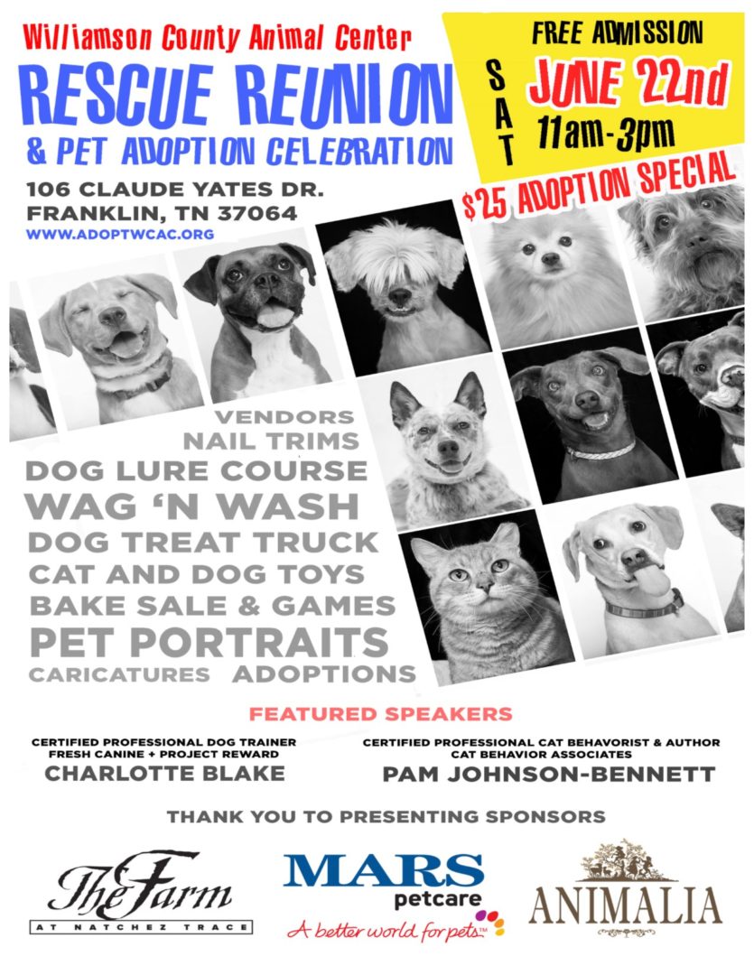 Free admission-bring your dog June 22 Williamson County Animal Center in Franklin presents a Rescue Reunion and Adoption Celebration on ...