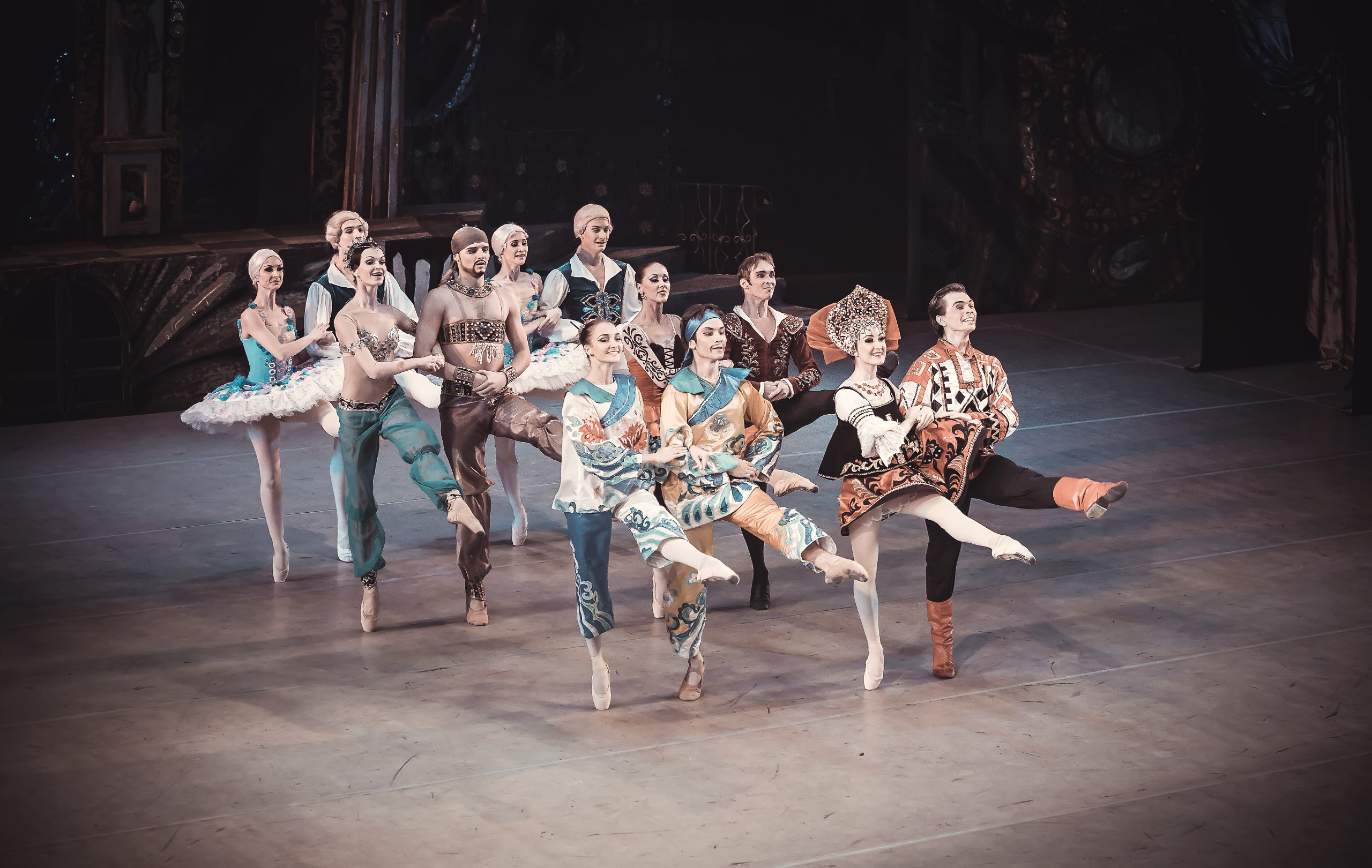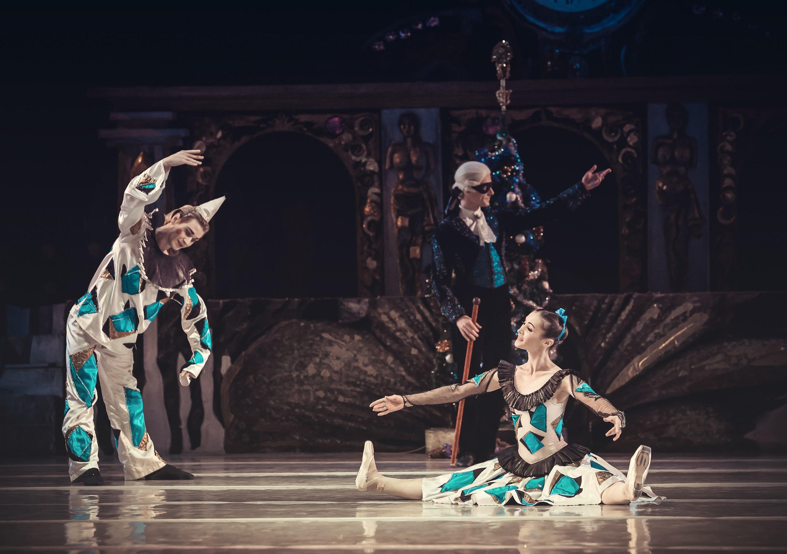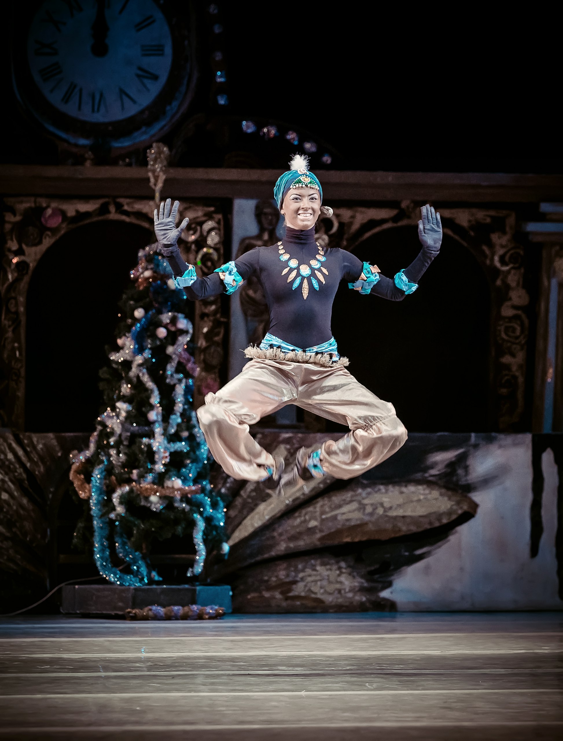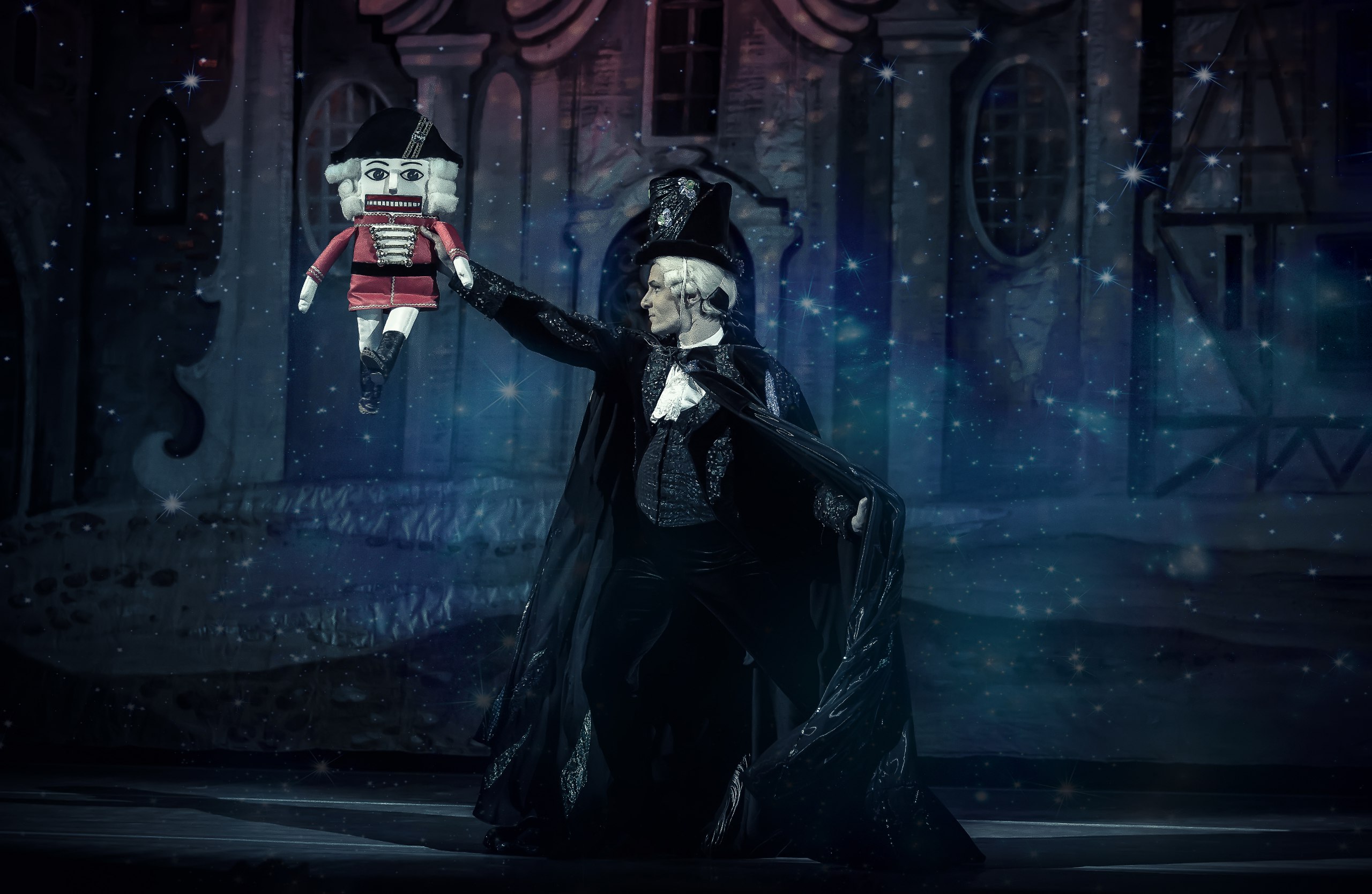 Act two: Mary and the Prince, along with the dolls that came to life, rejoice, celebrate, and dance under the starry sky next to the fantastically beautiful Christmas tree. Around them, it’s snowing heavily. Spanish, Chinese, Arab, and Slavic dolls dance in the joy of the victory over the Mouse King, who identified with evil. Everyone is getting ready for Mary and the Prince’s wedding. Drosselmeyer appears and everything changes around again. Mary wakes up and has Nutcracker in her arms.