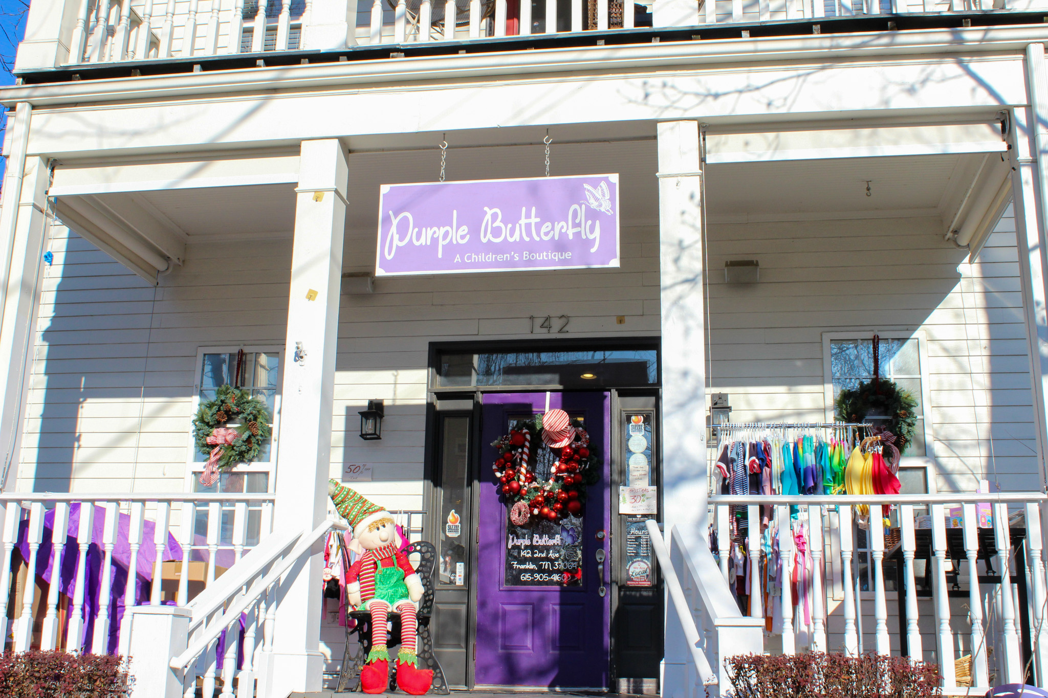 Just down the street from Elle Park is the most adorable specialty children’s boutique, The Purple Butterfly. If you have babies or young children on your Christmas gift list, this boutique is a must. Located in historic downtown, this house-turned-boutique is owned by a local couple who took being grandparents to the next level by opening their very own children’s shop.