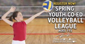 Registration is also available for the Williamson County Parks and Recreation’s (WCPR) spring 2021 Youth Co-ed Volleyball league for kids ages 7 to 15 (age as of August 31, 2020).