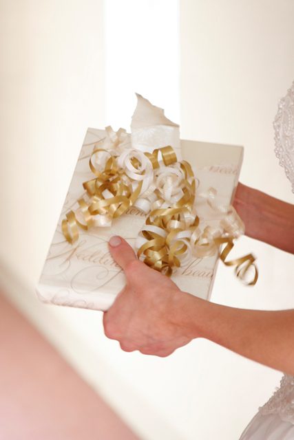 Many couples exchange their gifts the night before the wedding, either at the rehearsal dinner or just after. Some exchange gifts on the morning of the wedding. How do you do this and maintain the tradition of not seeing each other before the wedding? Easy! Send your bridesmaids and groomsmen to each other to present your gifts. This is a fun way to get your friends involved and make your gifts even more special.