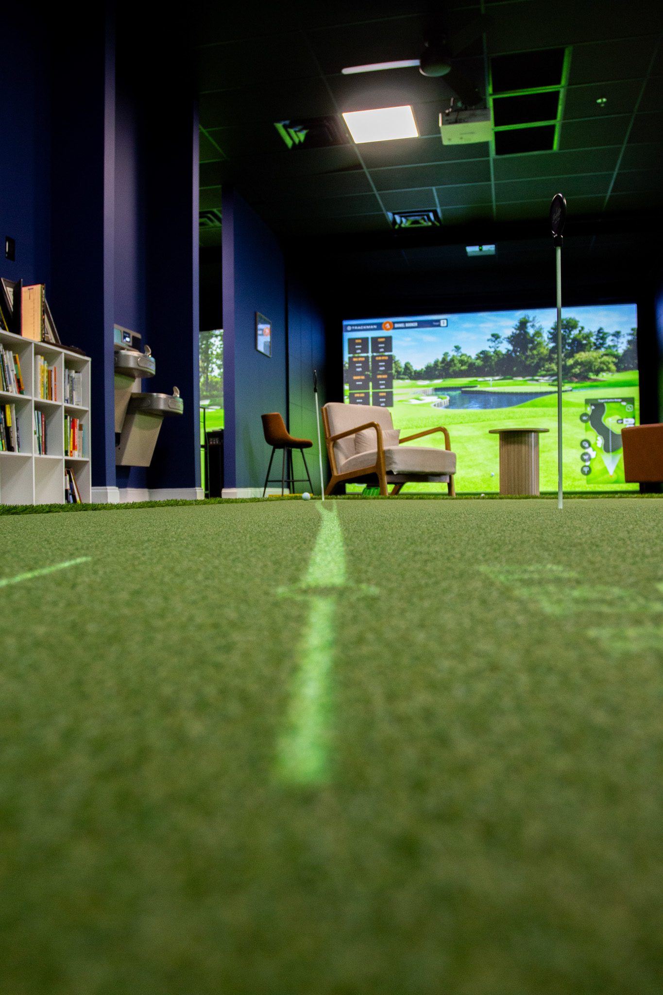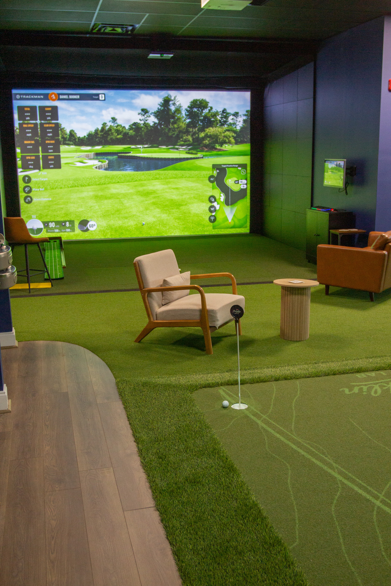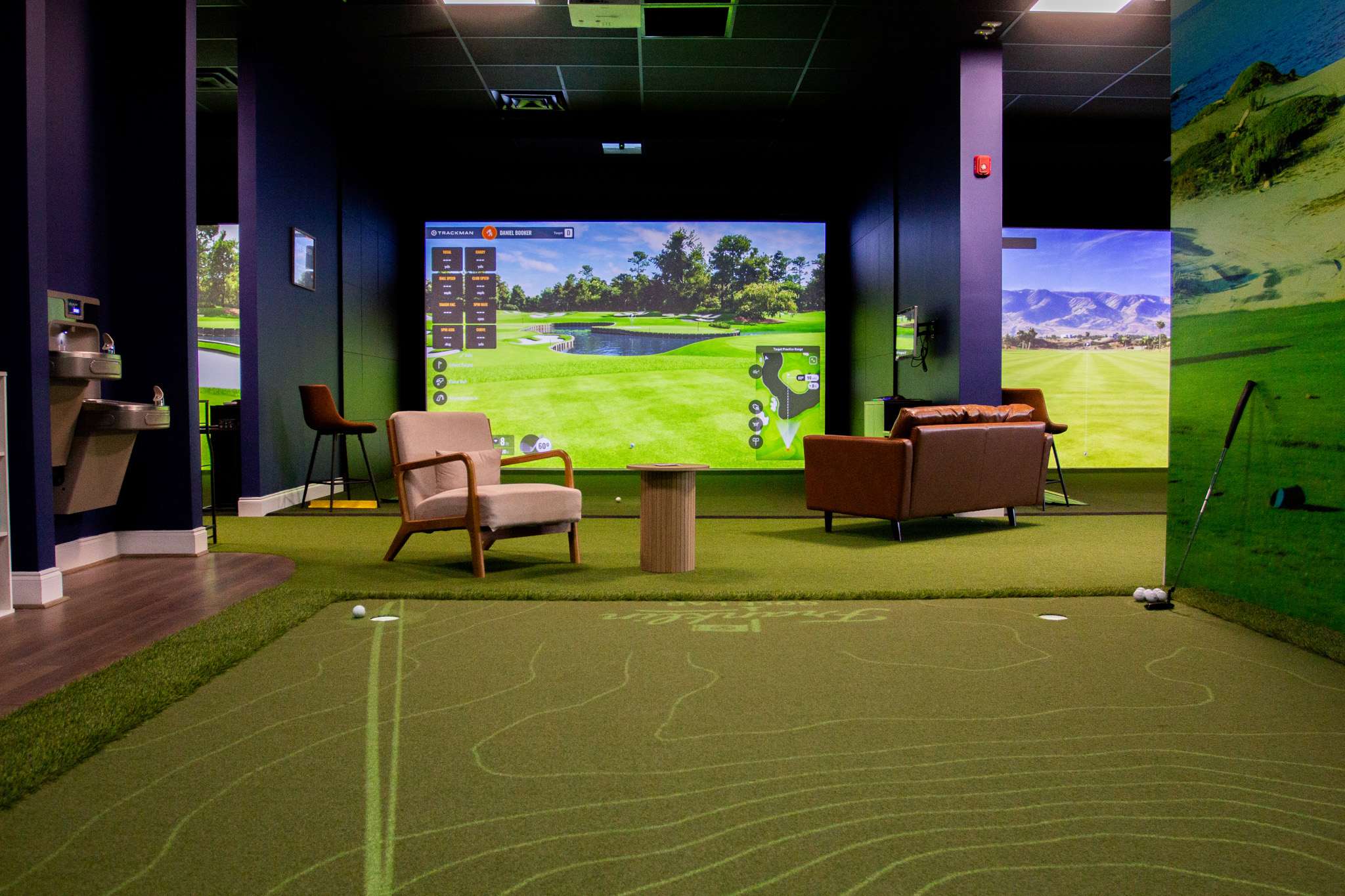 The result is a modern indoor facility equipped with the tools players need to understand their swing, sharpen their skills, and build confidence in every part of their game. The layout includes private hitting bays, advanced swing-analysis systems, and a holographic putting green powered by PuttView technology, which projects slopes, contours, and alignment guides directly onto the surface.
