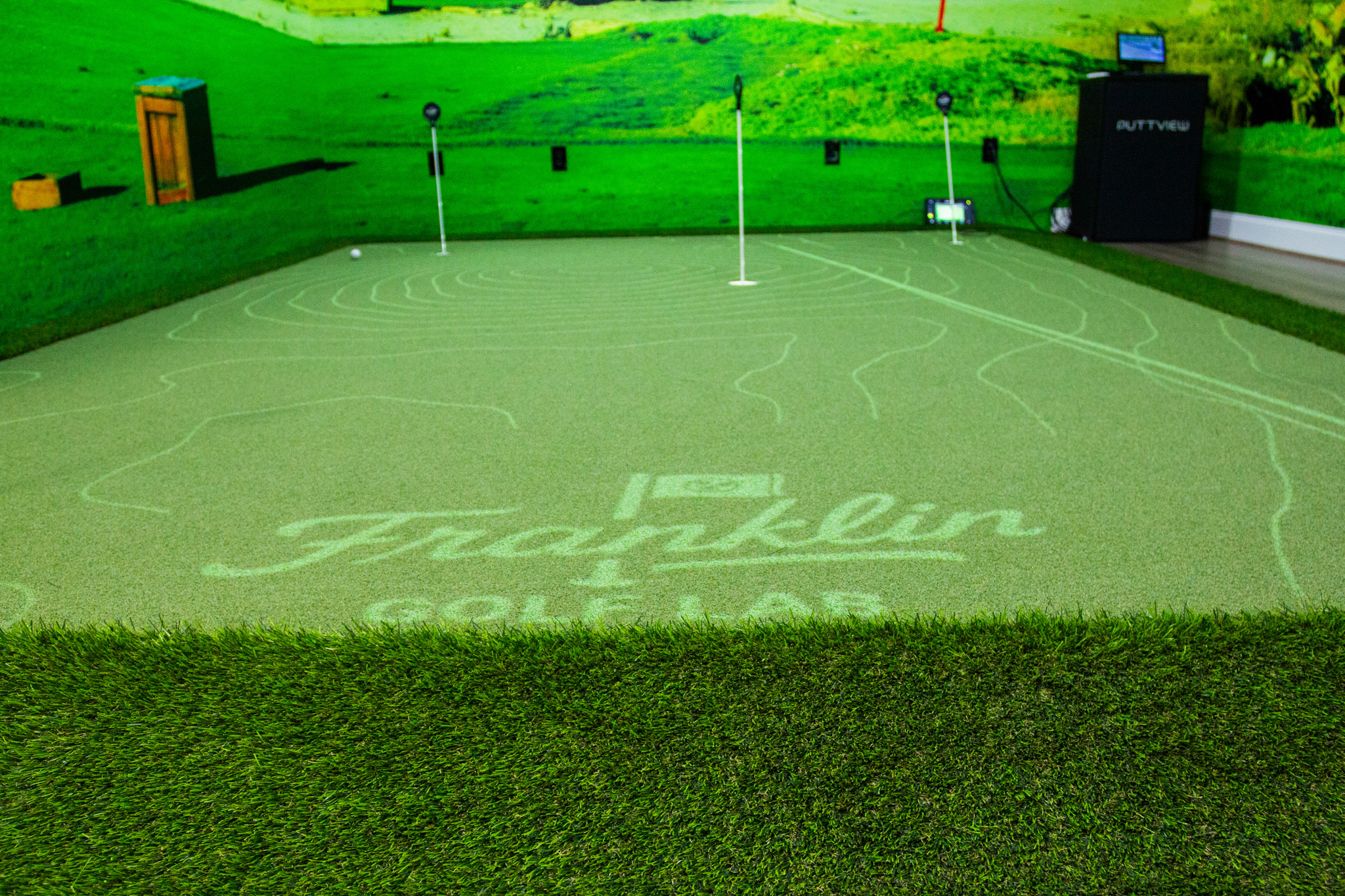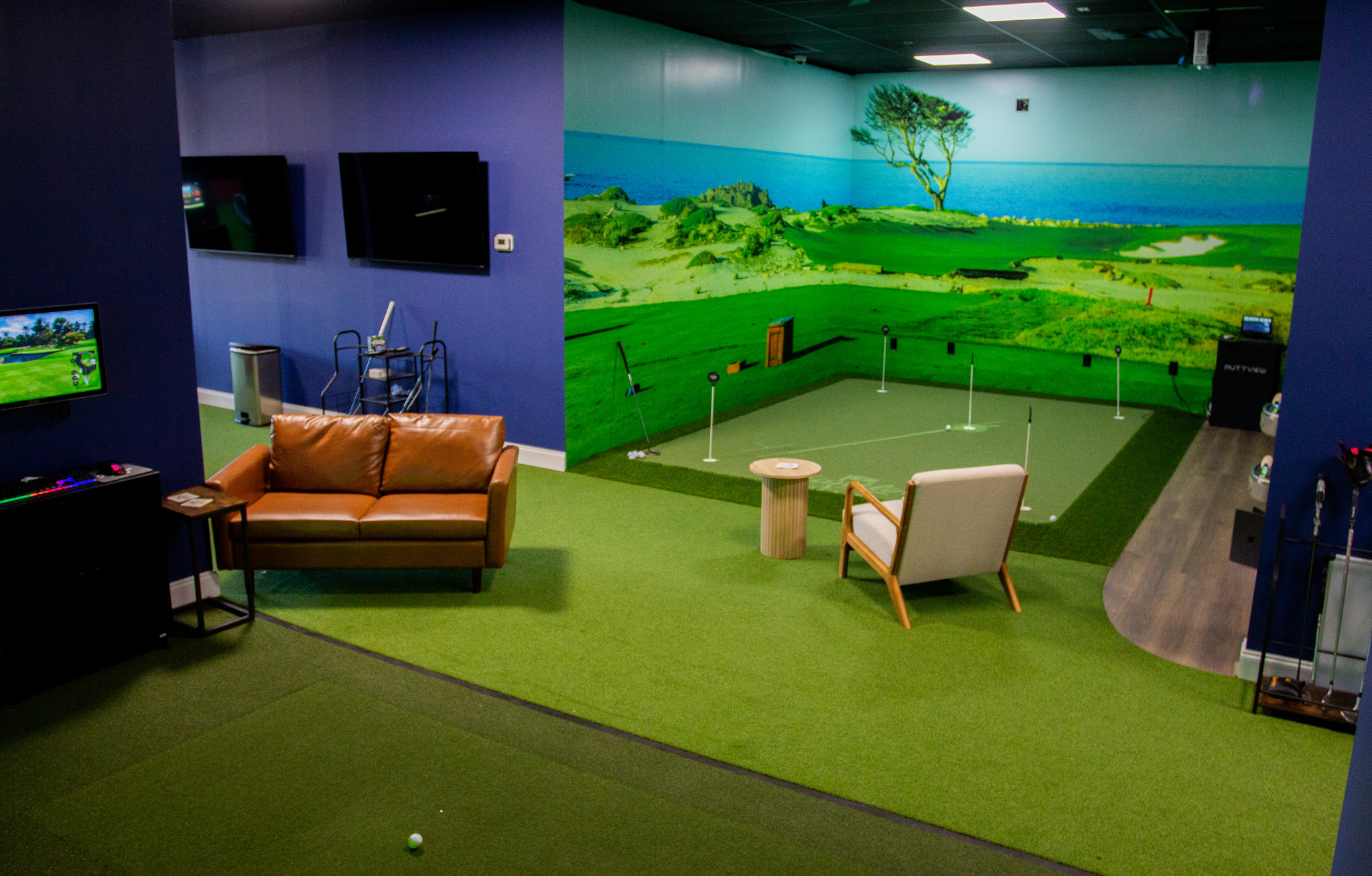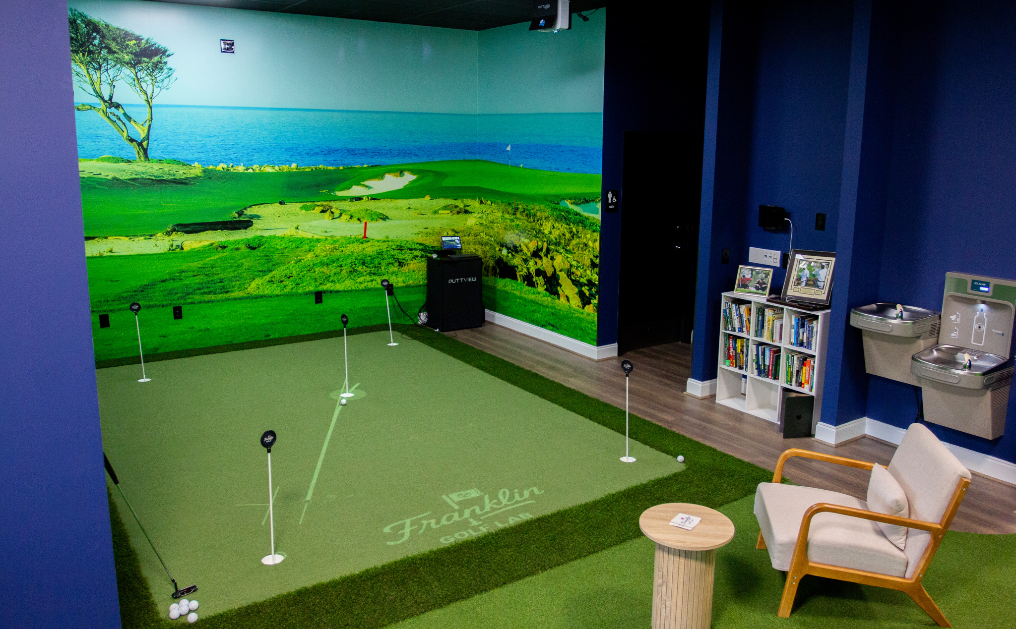 The result is a modern indoor facility equipped with the tools players need to understand their swing, sharpen their skills, and build confidence in every part of their game. The layout includes private hitting bays, advanced swing-analysis systems, and a holographic putting green powered by PuttView technology, which projects slopes, contours, and alignment guides directly onto the surface.