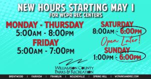 The Williamson County Parks and Recreation Department (WCPR) will open all outdoor pools and splash parks on Saturday, May 1, 2021. With the opening of these aquatic features; indoor facility hours of operation at participating locations will be extended on Saturdays and Sundays, and facilities will remain open until 6 p.m.