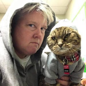 Found abandoned in the WCAC parking lot in March of 2020 (the day before the Covid-19 pandemic shutdown), Memaw was estimated to be at least 12 years old (that’s 65 in human years). Despite her age, she was active and vocal from the start, with a certain spunk and unmistakable meow that left no one in doubt that she was in charge! Crabby? Opinionated? Yes, but in the sweetest possible way. The shelter staff dubbed her ‘Memaw’ and she became WCAC’s mascot and senior cat advocate, drawing attention by giving signature head butts to her favorite humans, walking on a leash (what?) and calmly riding on the shoulders of shelter employee Penny Adams.