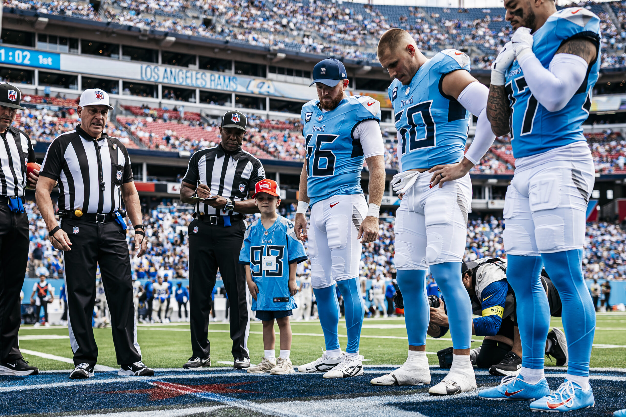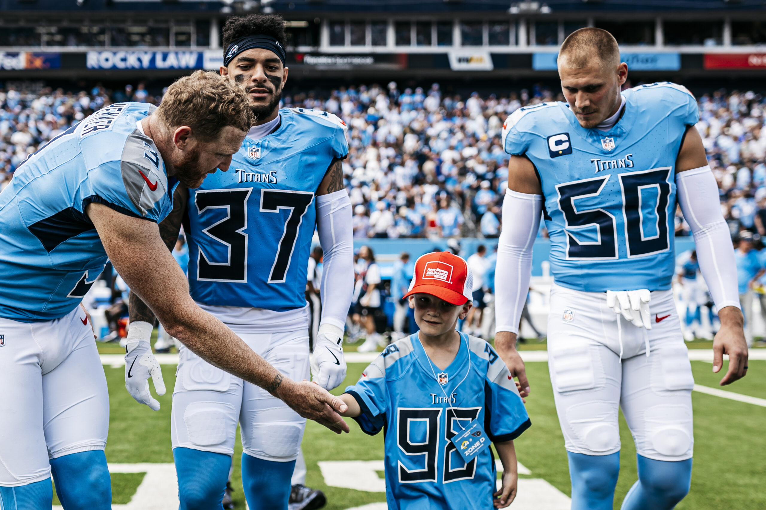 Punter Johnny Hekker #3 of the Tennessee Titans, Defensive back Amani Hooker #37 of the Tennessee Titans, Linebacker Cody Barton #50 of the Tennessee Titans before the game between the Tennessee Titans and the Los Angeles Rams at Nissan Stadium on September 14, 2025 in Nashville, TN. Photo By Donald Page/Tennessee Titans