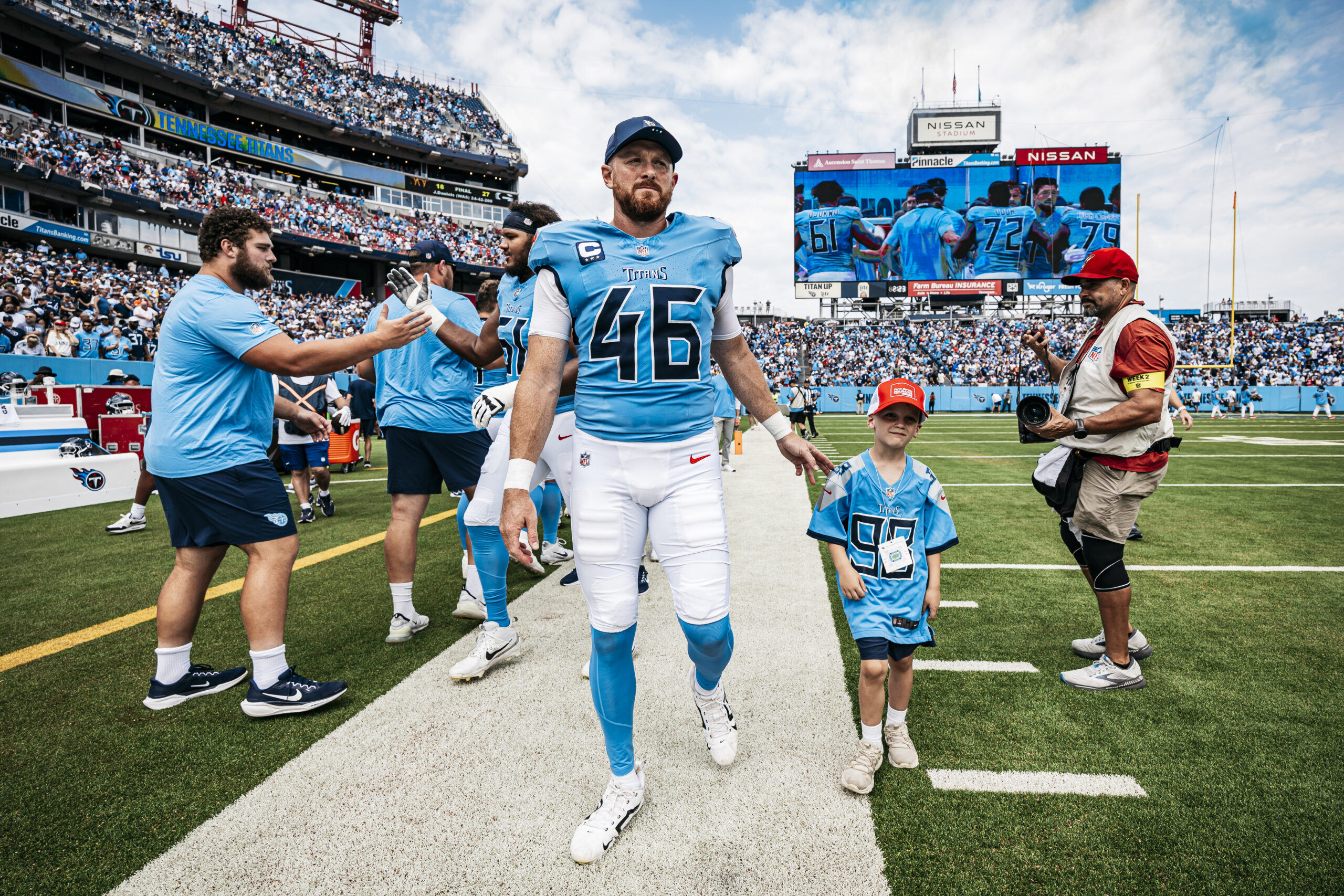 Longsnapper Morgan Cox #46 of the Tennessee Titans, Linebacker Cody Barton #50 of the Tennessee Titans, Defensive back Amani Hooker #37 of the Tennessee Titans before the game between the Tennessee Titans and the Los Angeles Rams at Nissan Stadium on September 14, 2025 in Nashville, TN. Photo By Donald Page/Tennessee Titans
