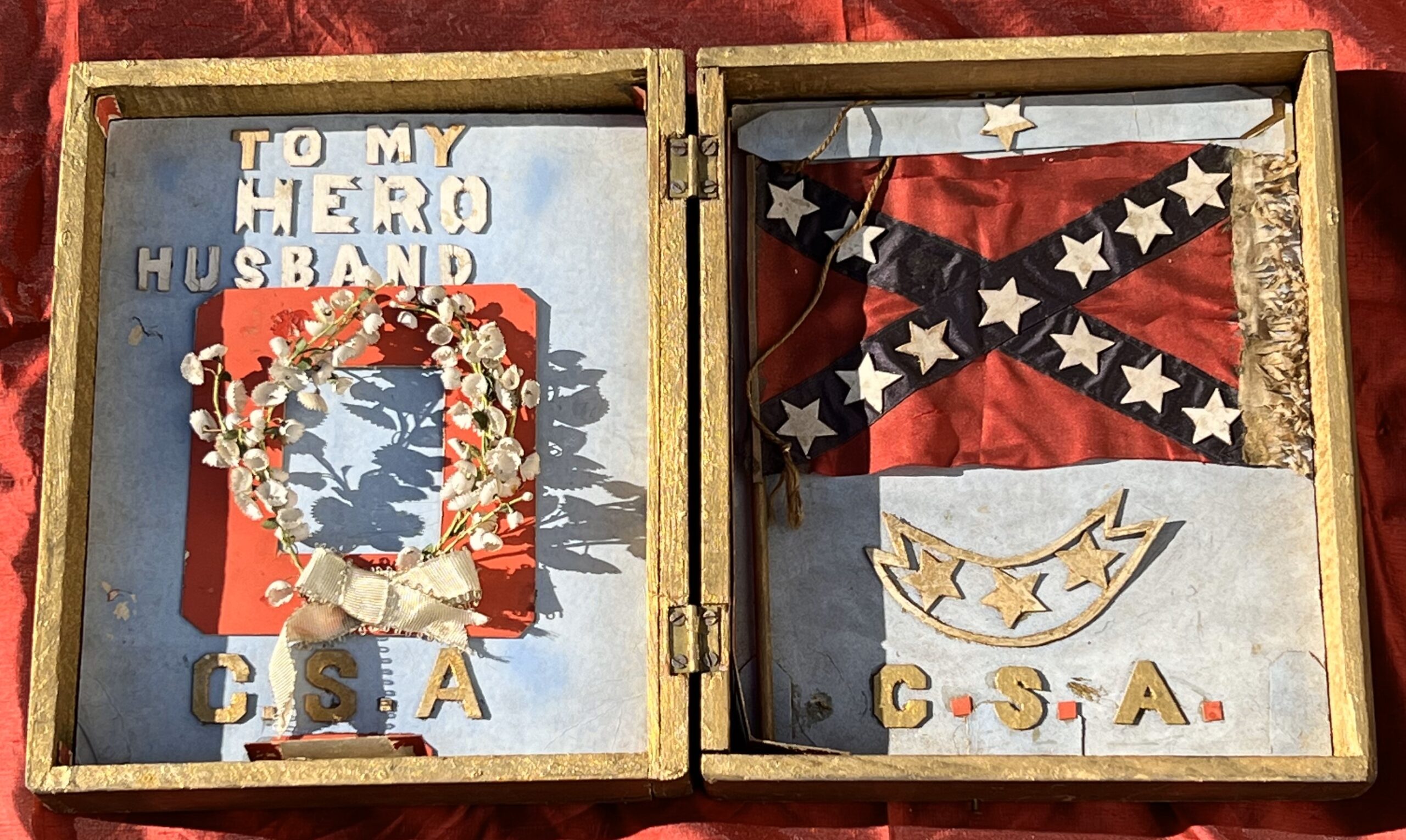 Upon his return to Tennessee, his wife Mary welcomed her husband home by presenting him with a very special wooden box. On the outside are his initials J-R-S, on the inside left it reads “To My Hero Husband” over a wreath of flowers and on the right-side Mary attached a handsewn battle flag. Because the box has been tightly closed for more than 1OO years, the color of the flag today is as bright and crisp as it was when Savage first received it. It is a loving, heartfelt tribute from a wife to her husband who finally made his way home to her.
