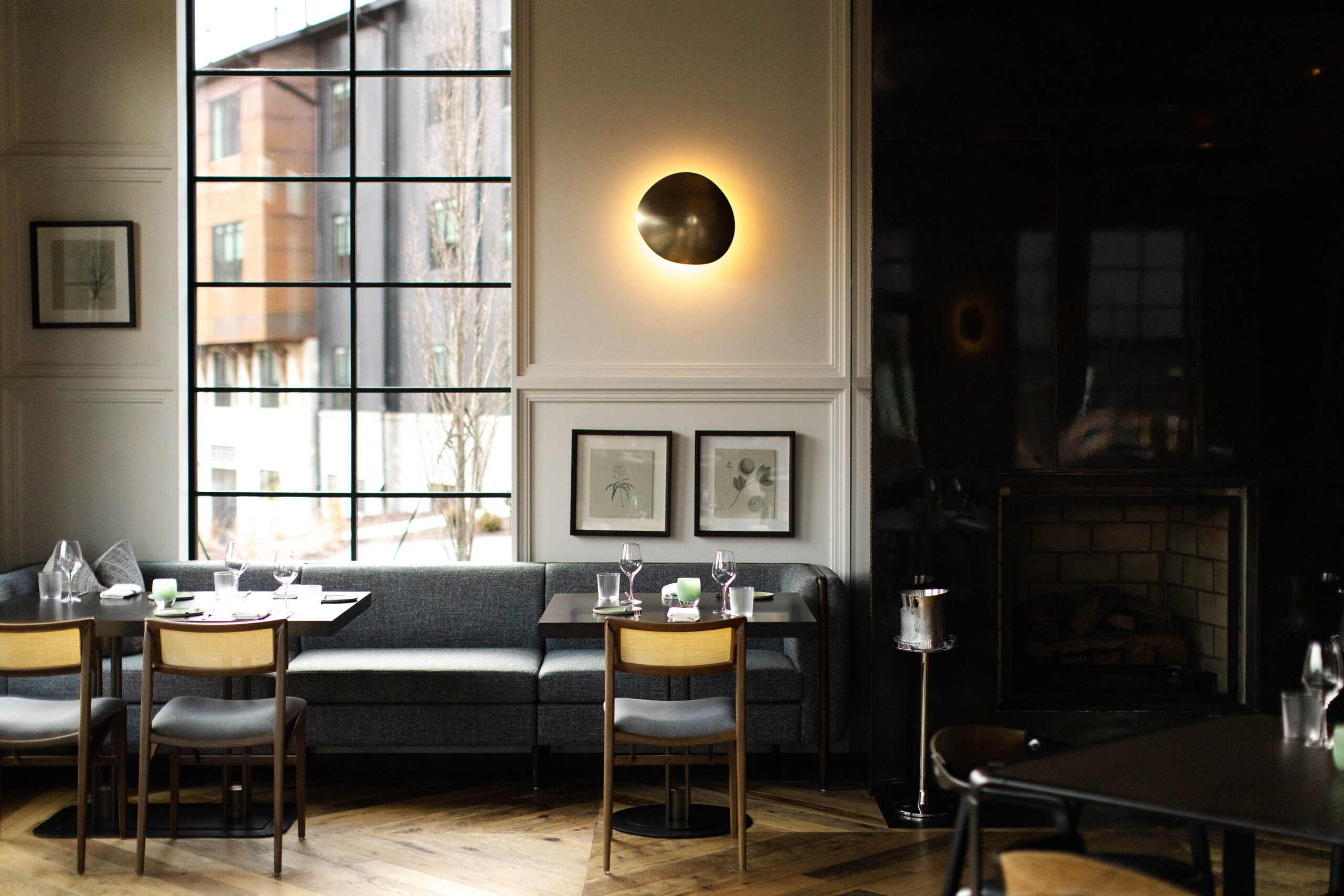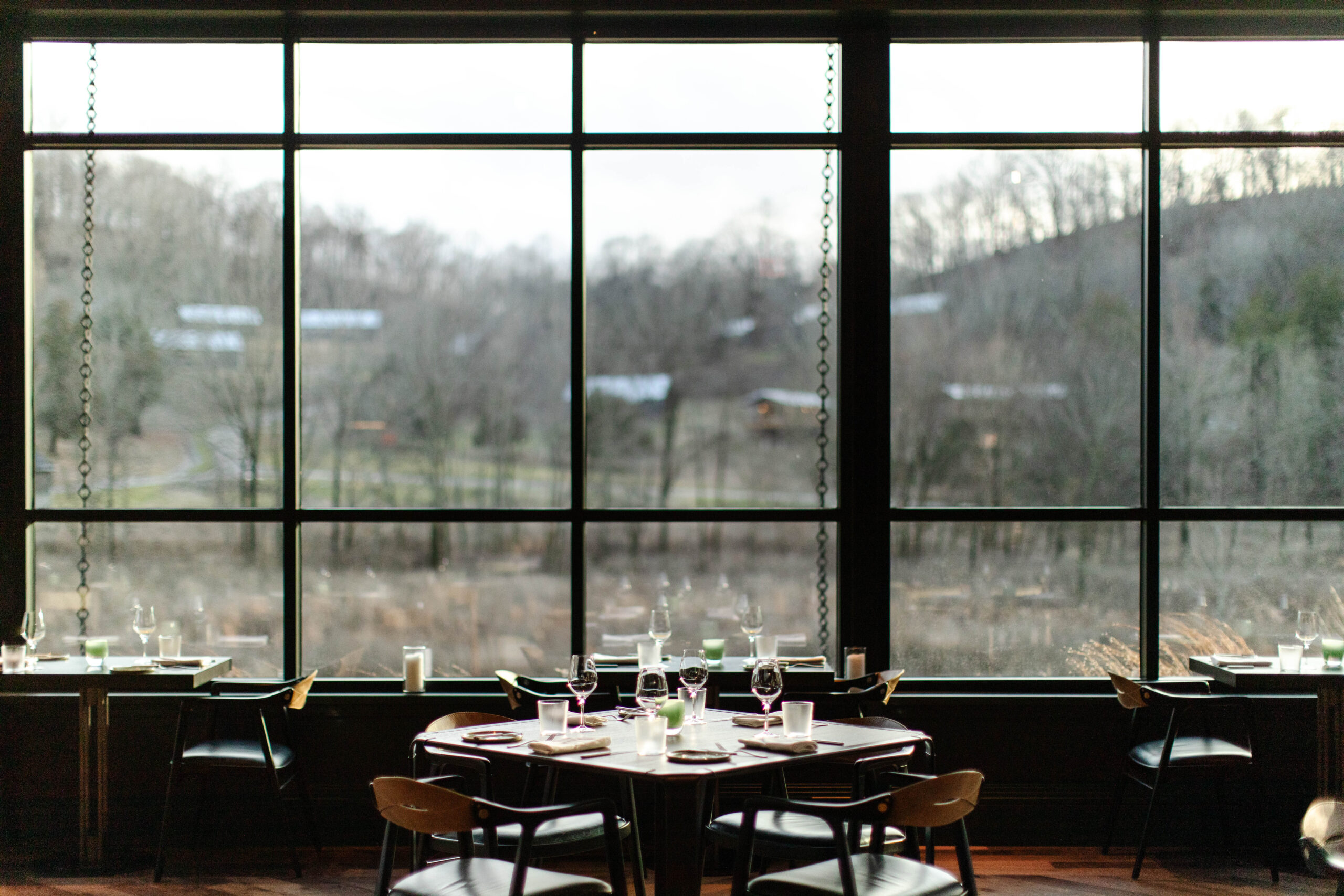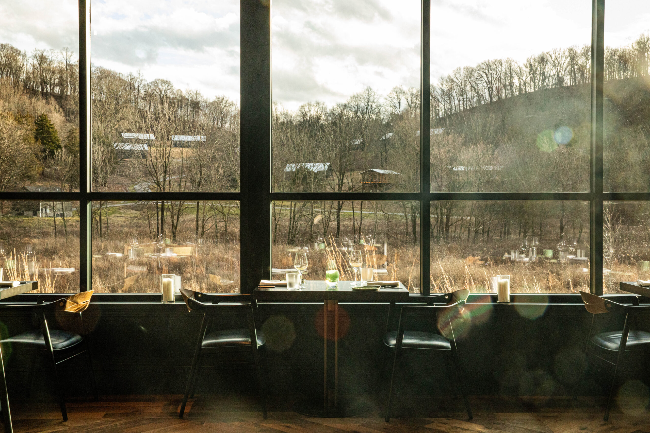 In addition to those in the community that have contributed to January’s culinary excellence, Southall worked closely with the team at IndiDesign to create a space not only inspired by the land, but created by it. Encased by panoramic views of Southall’s foliage, January’s intimate dining space features a variety of intricacies, grand to minute, including: a signature log table created by Tennessee-based custom furniture store, Good Wood, using lumber that was sourced on the property with additional woodworking completed by Born Again Barnwood; ceramic plateware designed and handmade by RV Pottery and Hallyburton Pottery; to the leather check presenters created by Narrow Gate Leather Goods and the black and white botanical sketches of plants found on property, commissioned by Nashville-based artist, Richard Bowers. The interactive kitchen, designed in tandem with Chef Klamar by Next Step Design featuring custom grills by Grills by Demant, presents an inside look from inception to presentation, lending an added collaborative energy to the space.