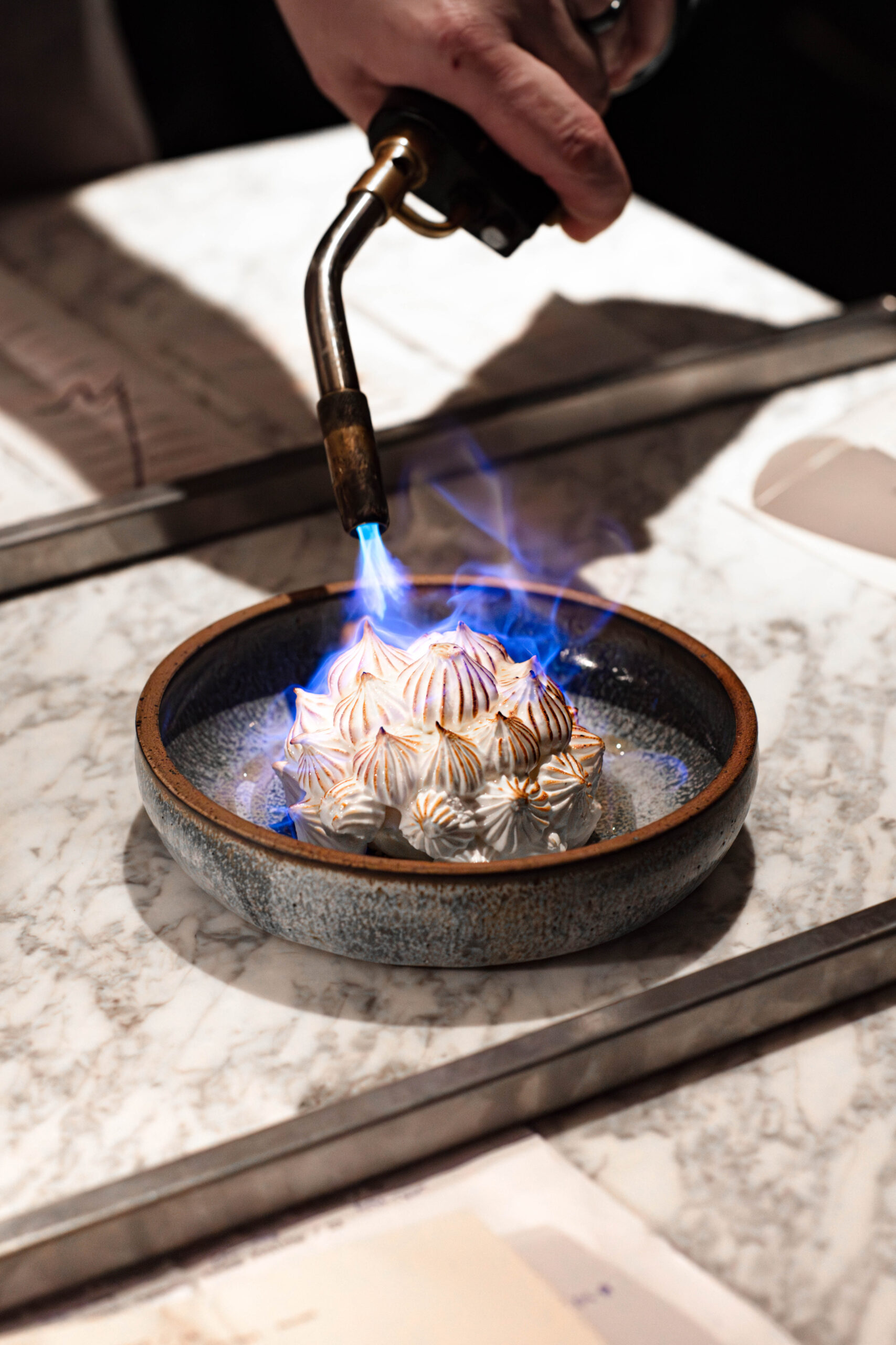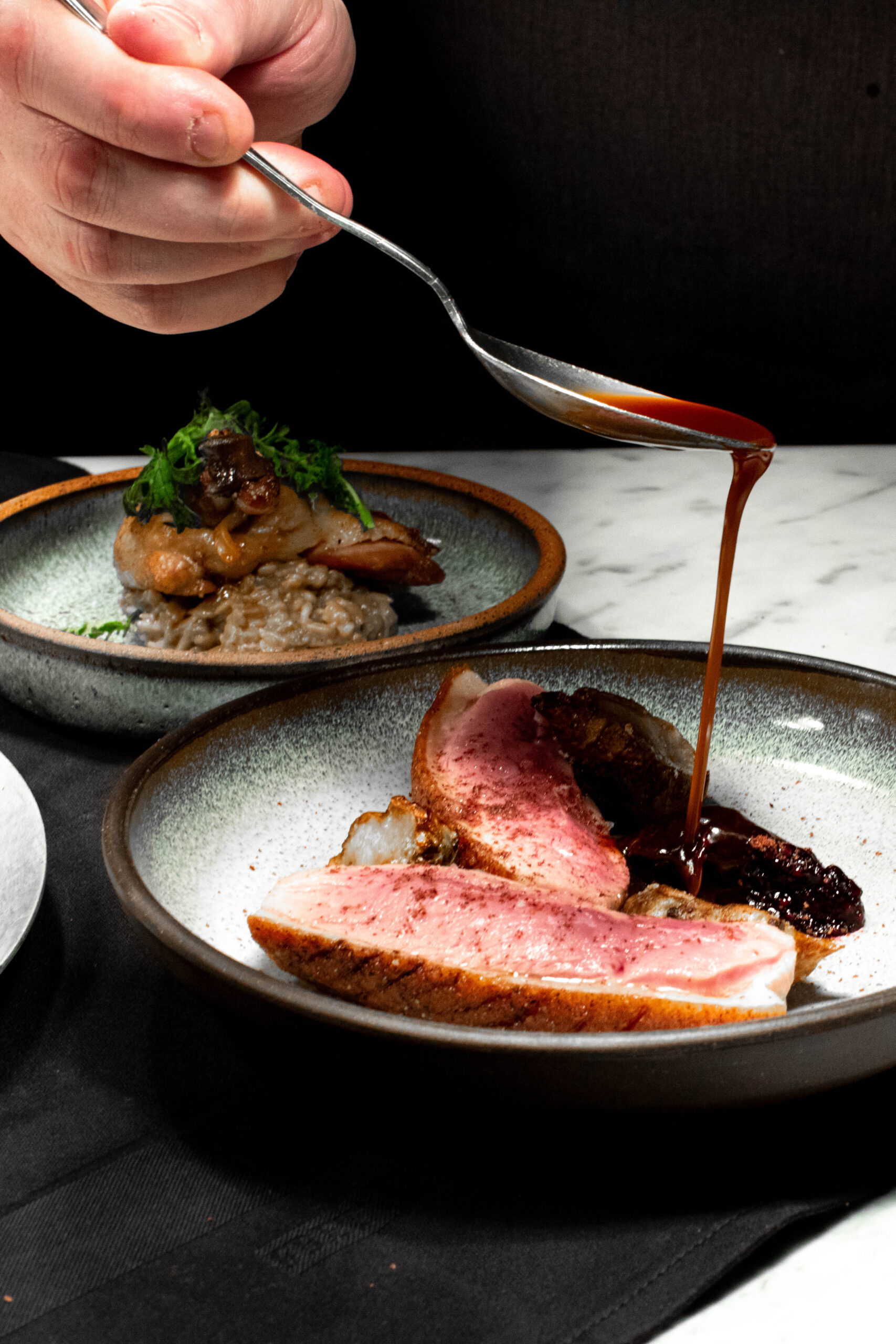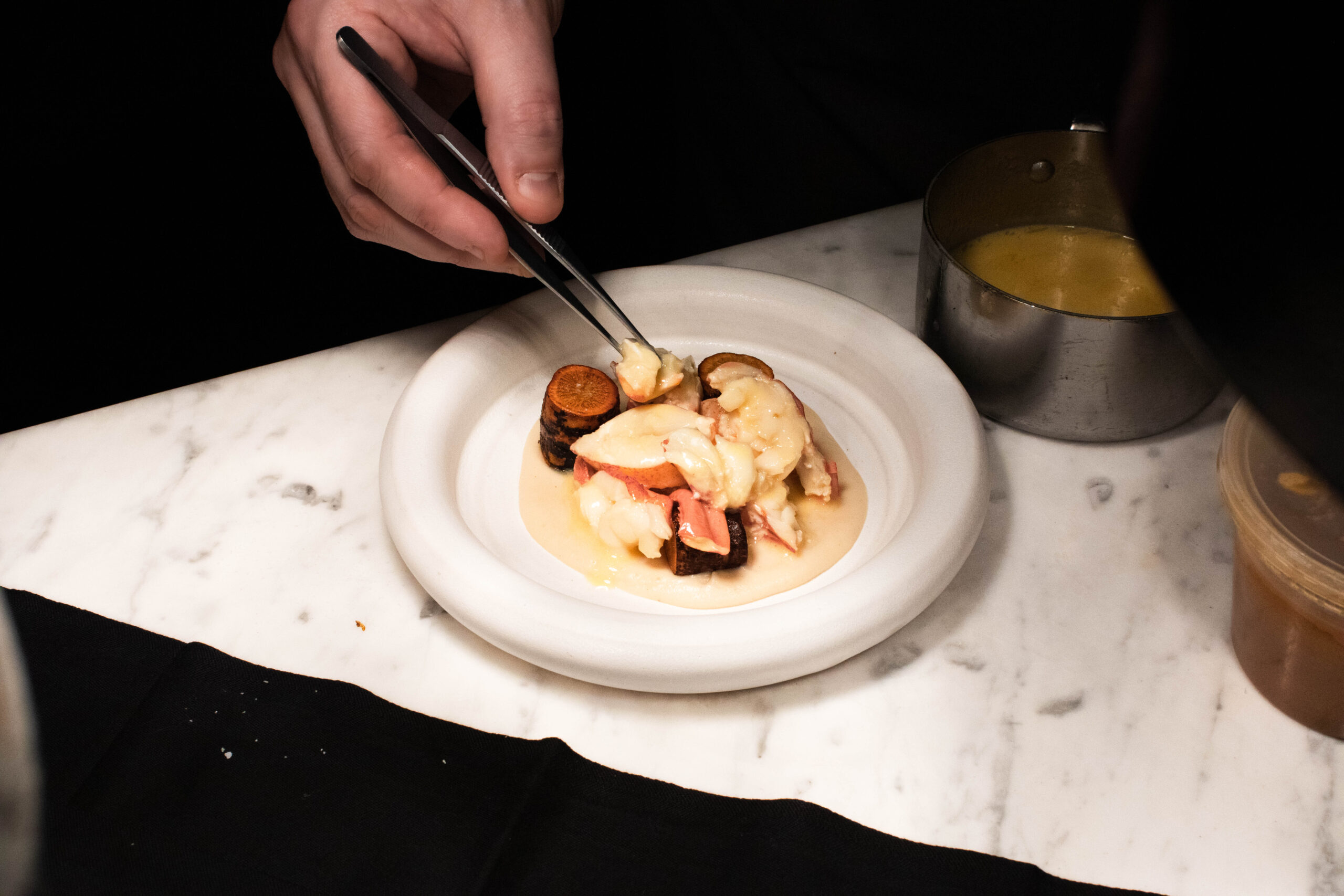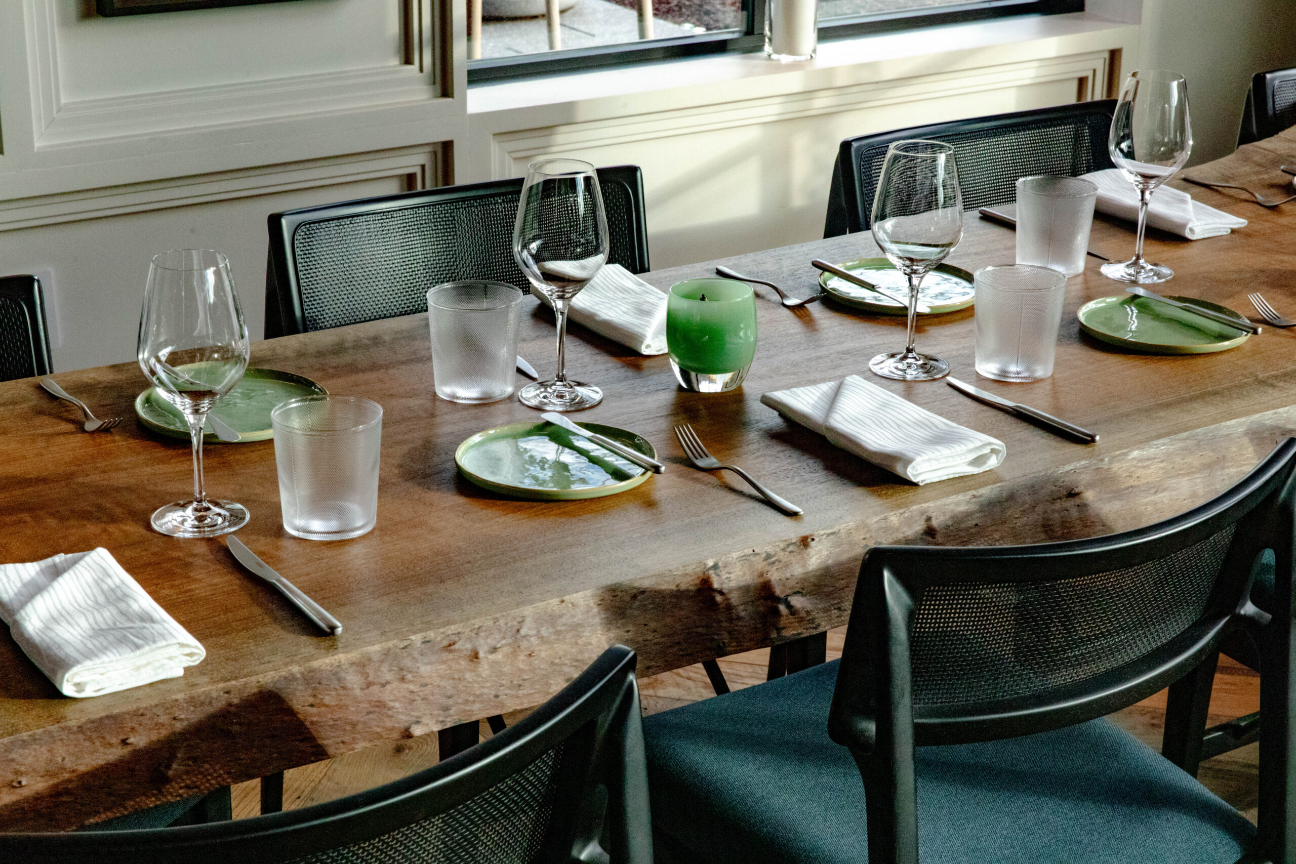 In addition to those in the community that have contributed to January’s culinary excellence, Southall worked closely with the team at IndiDesign to create a space not only inspired by the land, but created by it. Encased by panoramic views of Southall’s foliage, January’s intimate dining space features a variety of intricacies, grand to minute, including: a signature log table created by Tennessee-based custom furniture store, Good Wood, using lumber that was sourced on the property with additional woodworking completed by Born Again Barnwood; ceramic plateware designed and handmade by RV Pottery and Hallyburton Pottery; to the leather check presenters created by Narrow Gate Leather Goods and the black and white botanical sketches of plants found on property, commissioned by Nashville-based artist, Richard Bowers. The interactive kitchen, designed in tandem with Chef Klamar by Next Step Design featuring custom grills by Grills by Demant, presents an inside look from inception to presentation, lending an added collaborative energy to the space.