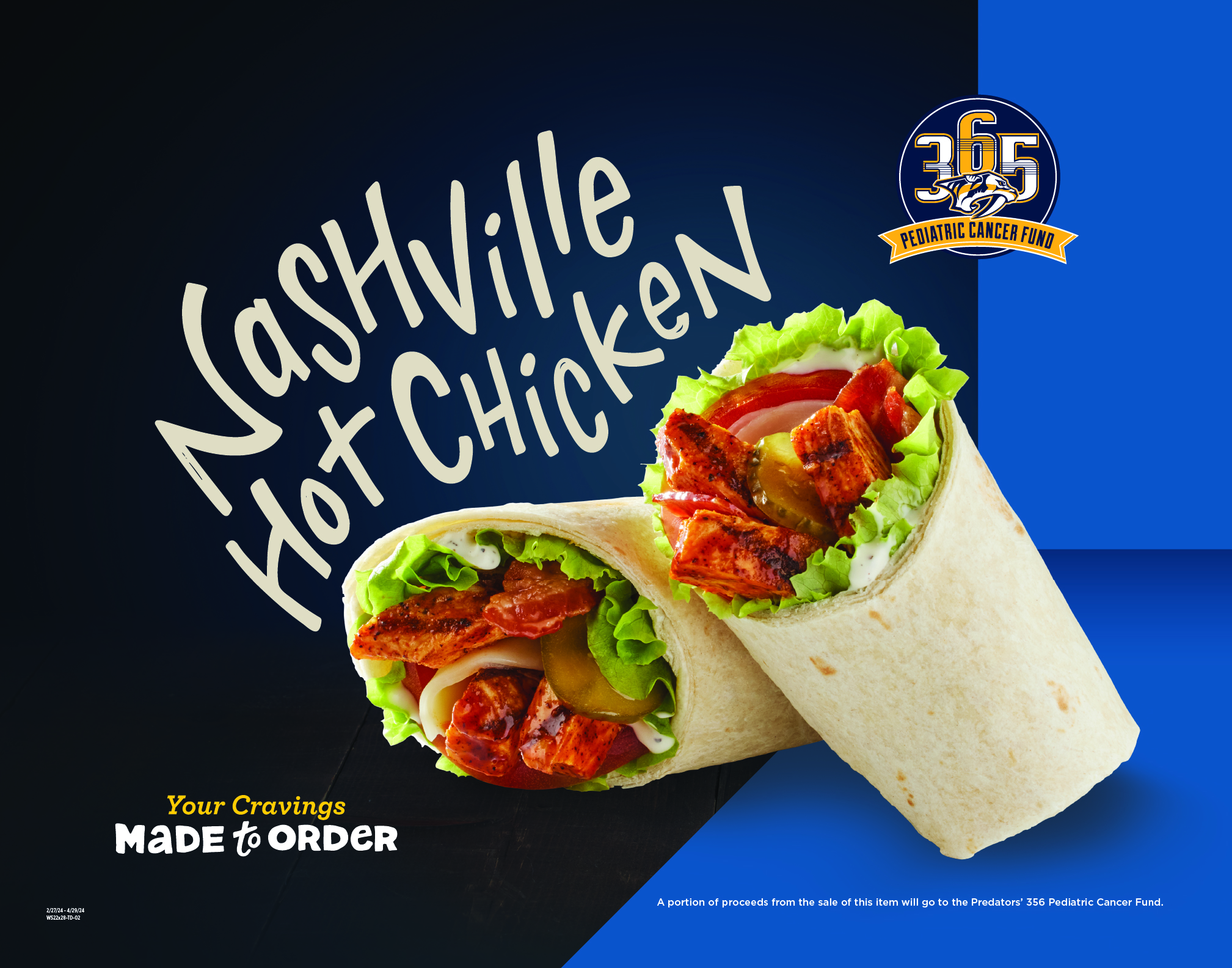 The wraps will be added to the menu for guests to customize with fresh ingredients to their preference. Guests will have the choice between turkey and swiss, Italian, ham and cheddar and lastly, the Nashville Hot Chicken wrap. For all Nashville Hot Chicken wraps sold, a portion of the proceeds go toward the Nashville Predators’ 356 Pediatric Cancer Fund.