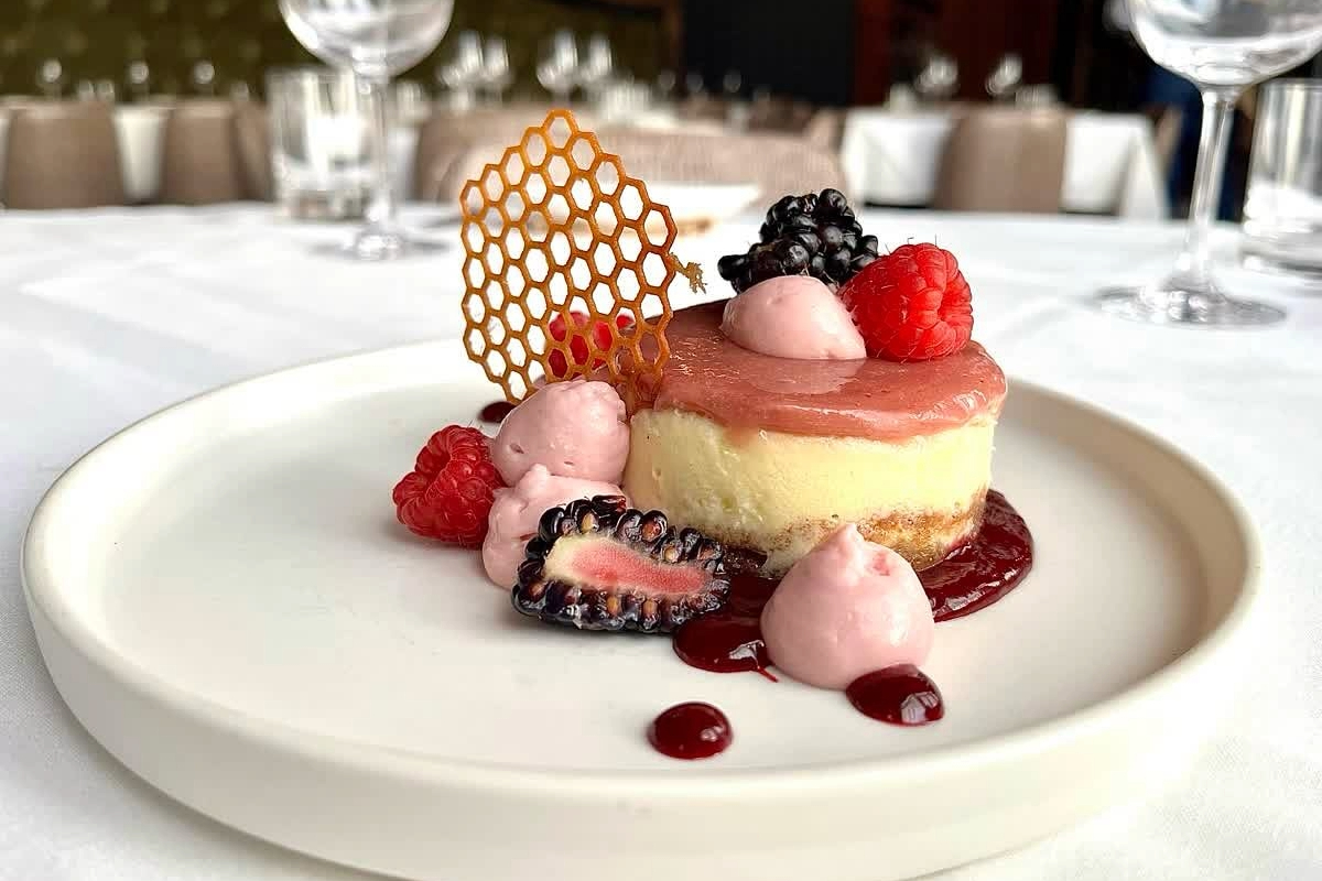 Desserts extend the fine dining experience with original updates to classics. Choices include vanilla bean crème brûlée topped with berries, key lime and strawberry paired with churro tuile and sabayon, and vanilla cheesecake with raspberries, blackberries, graham cracker, and honey.
