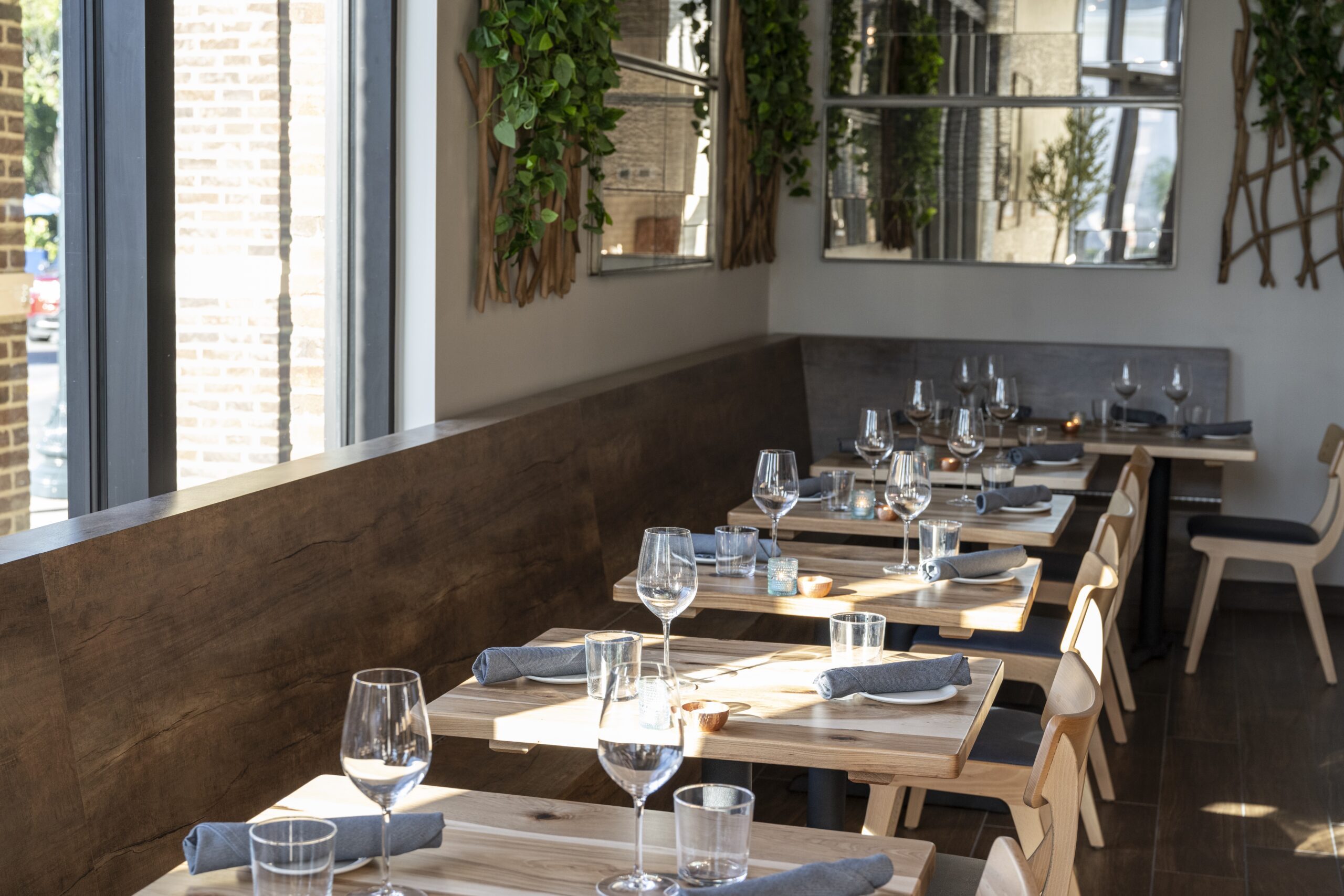 Located at The Factory at Franklin, etch’s Franklin outpost pairs a light-filled dining room with an open kitchen and chef’s counter. Black table linens, pendant lighting, and greenery against white walls create a crisp look, while a row of seats facing the cooks brings a little theater to dinner. There’s also a lively bar area and more private spaces for groups.