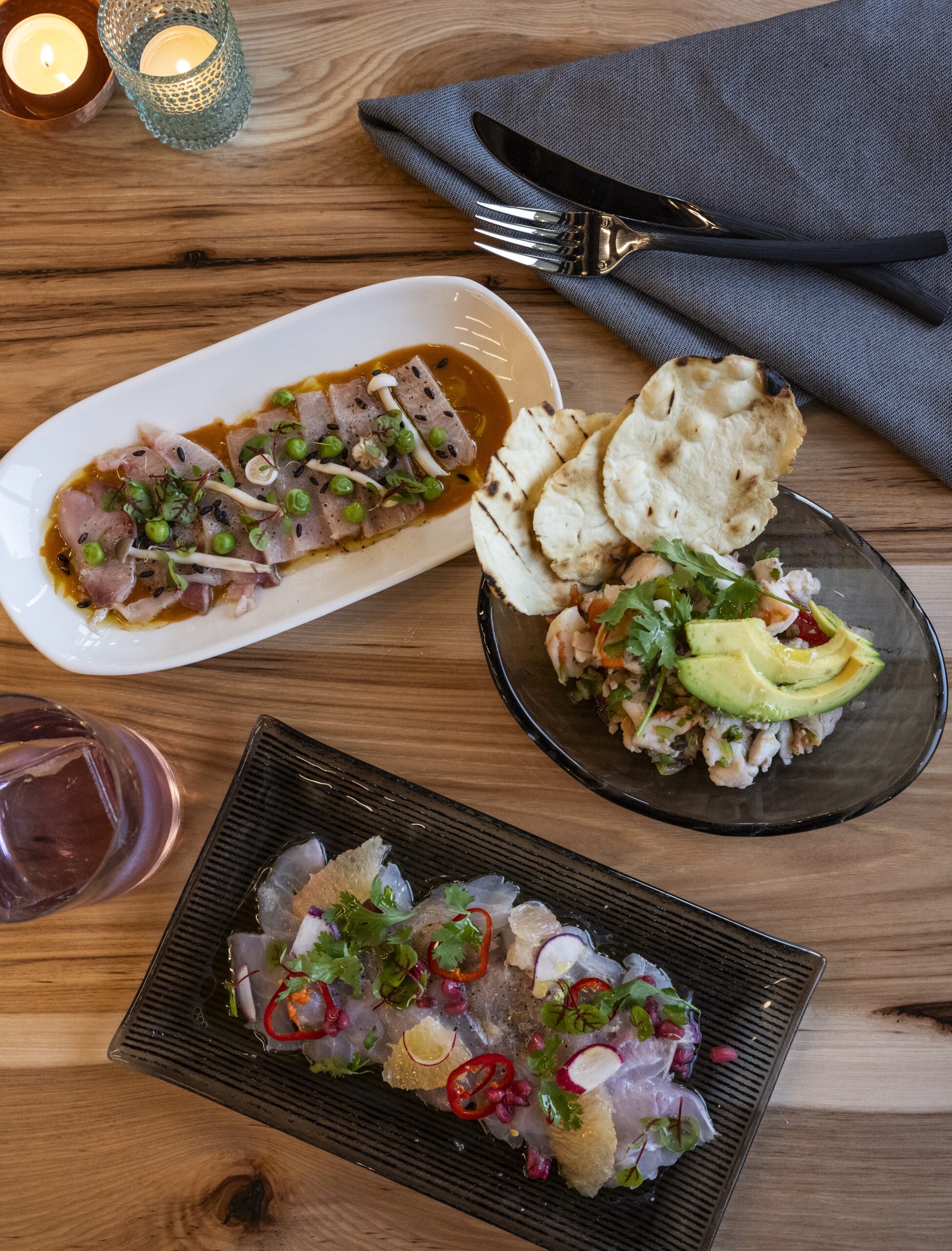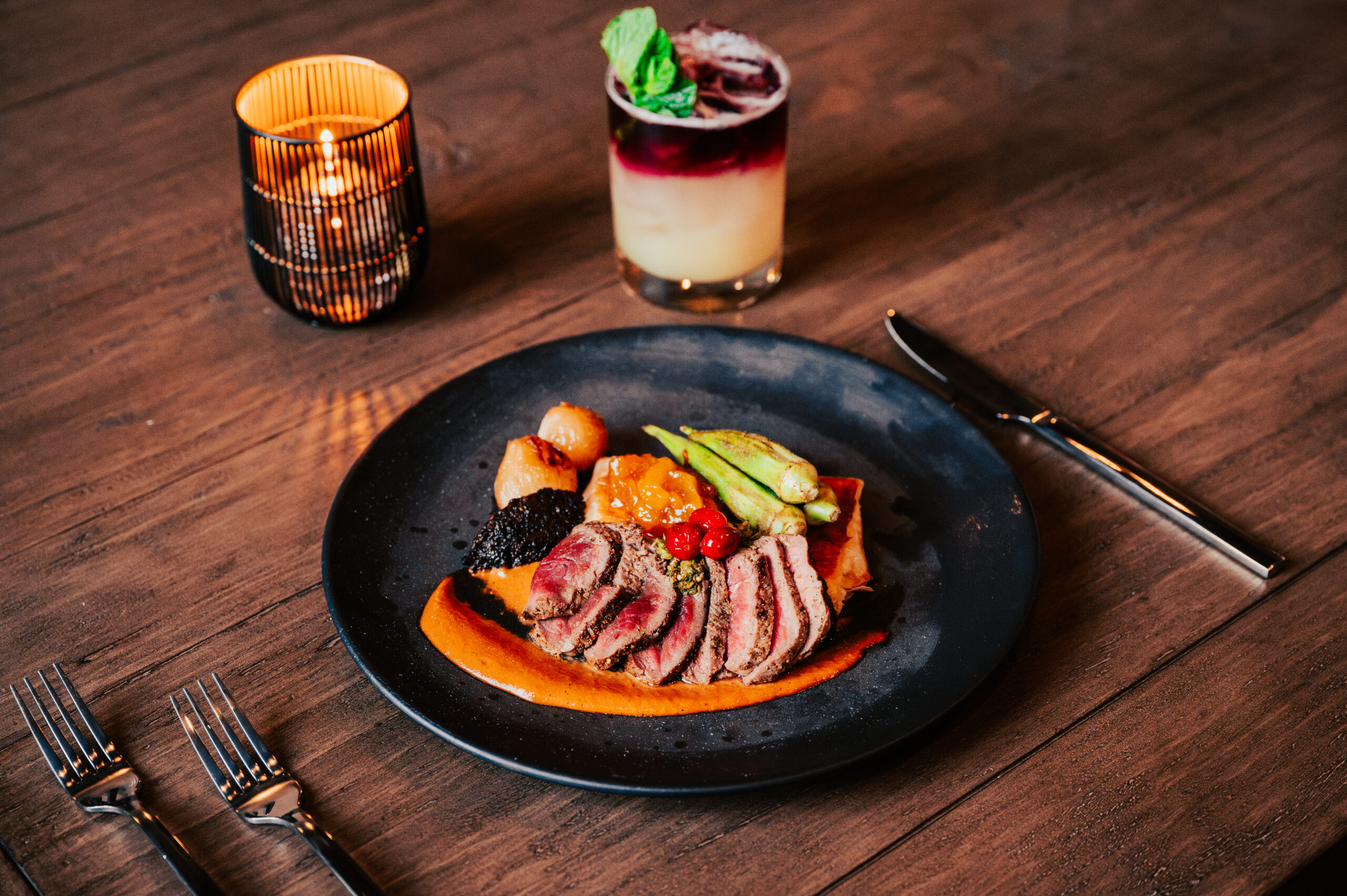 The menu mirrors chef Deb Paquette’s globe-spanning style. Starters include duck tart on puff pastry with orange curd and red-licorice mole and roasted cauliflower over truffled pea purée. The entrée selection features dishes like pan-seared scallops in Thai lemongrass curry with a crispy rice cake, a grilled filet mignon with horseradish whipped potatoes and red-wine gastrique, and the vegetarian “trio de setas” layered with porcini brûlée and confit shiitakes.