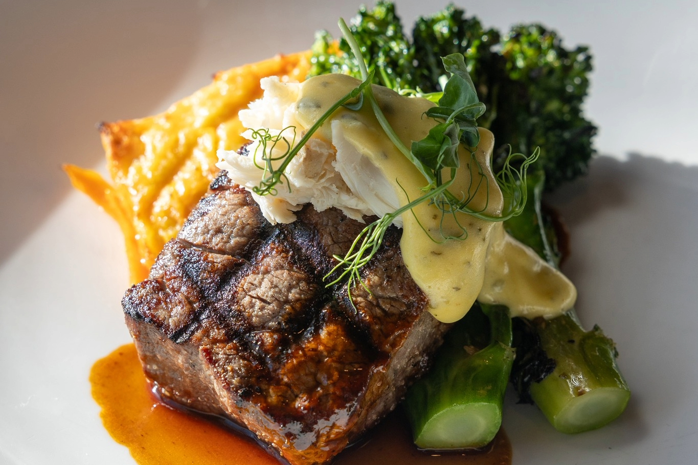 The kitchen is best known for steaks, including filet, New York strip, and a 45-day dry-aged ribeye, all grilled over hickory and oak and served with house potatoes. Enhancements like garlic shrimp, Maine lobster tail, and black truffle butter allow guests to tailor their plates. Seafood and non-beef entrées round out the menu, with options such as grouper with poblano butter, rabbit pot pie, and scallop and shrimp gnocchi with black truffle and broccolini.