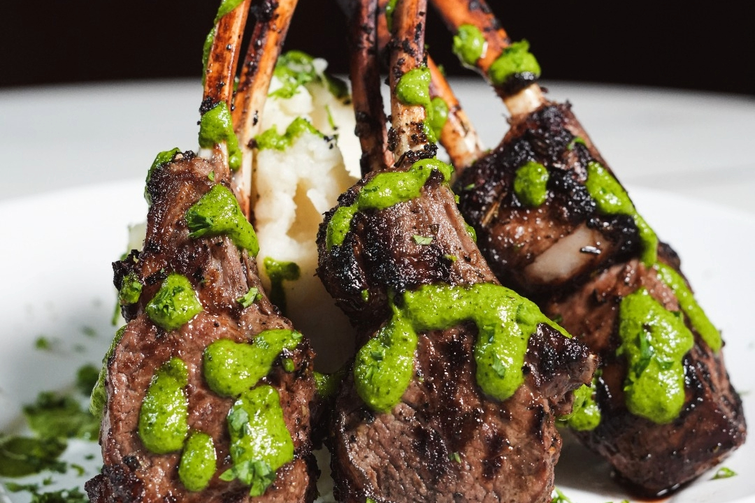 The menu showcases Southern flavors interpreted with a fresh approach. Starters include grilled lamb chops with mint chimichurri and pork belly biscuits with green tomato jam, both rich introductions to the meal. Entrées highlight dishes like shrimp and grits prepared with apple bacon and mushrooms, stuffed portobello layered with couscous, chickpeas, chermoula, fig, and zaloouk, or wild boar carnitas paired with jicama slaw.