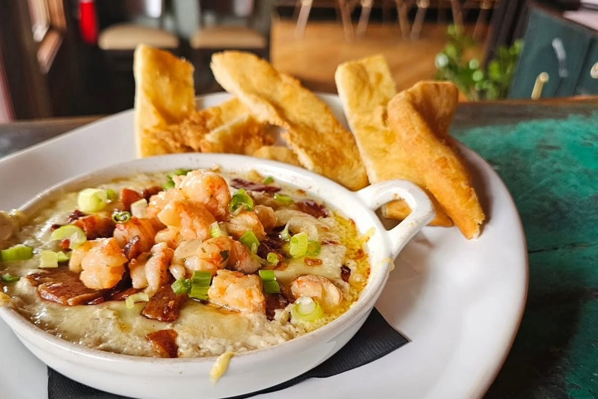 Located on Main Street, Cork & Cow has been part of the downtown Franklin dining scene since 2011. The dining room features exposed brick, elegant chandeliers, and walls adorned with stacked wood and vintage butcher cleavers. The bar, framed by glowing pendant lights and an impressive whiskey display, adds energy to the room.