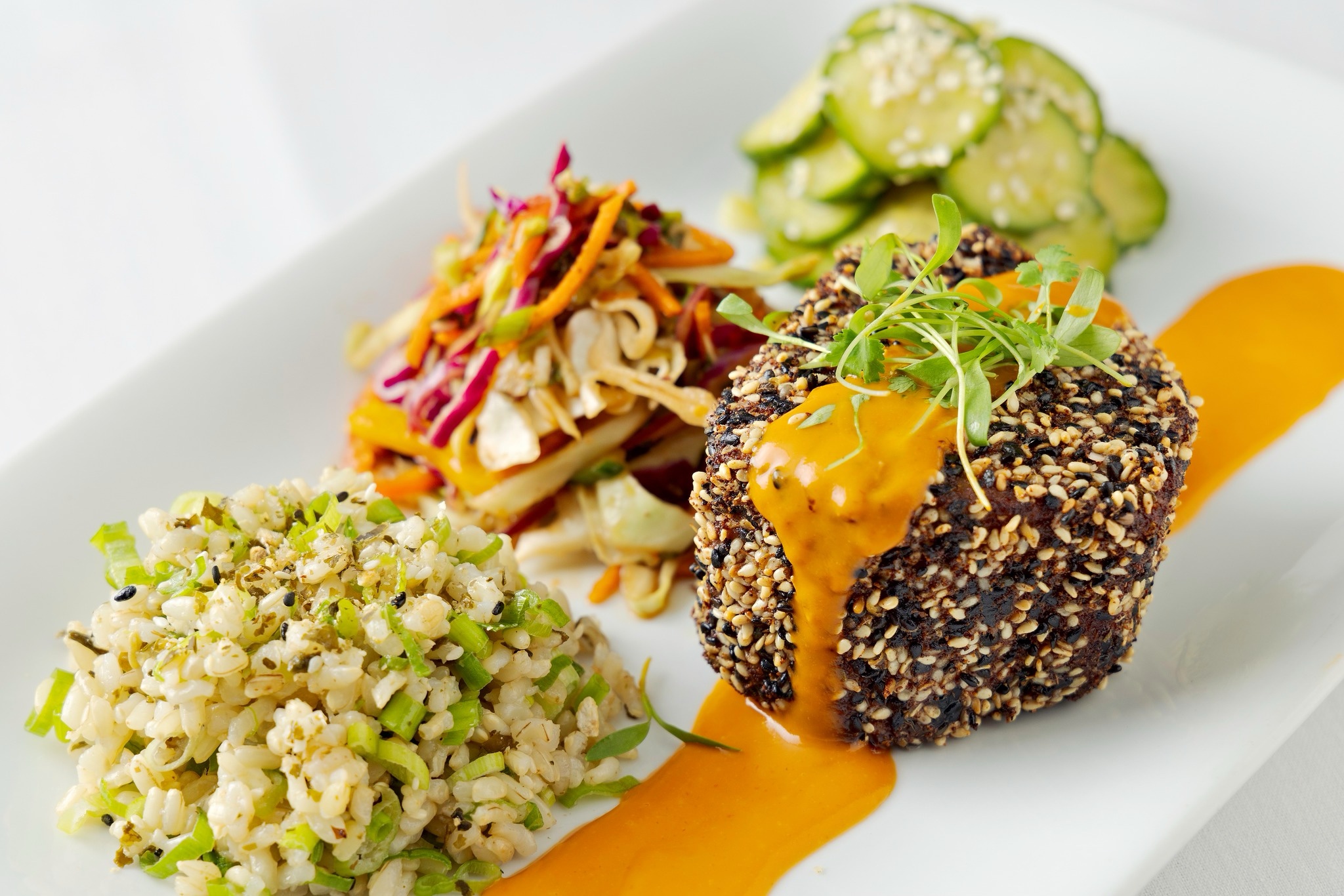 Desserts keep the creativity going, with options like a blueberry-pistachio pavlova with lavender cream, or a chocolate mousse bar over a buckwheat brownie.