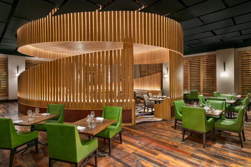 Inside The Harpeth Hotel in downtown Franklin, 1799 has been serving guests since the hotel opened in 2019, establishing itself as one of the city’s signature dining destinations. Curved booths sit behind wood-slat partitions beneath a sculptural wood ceiling, while tufted banquettes with floor-to-ceiling drapery create semi-private alcoves. A central bar anchors the space, and patio tables with heaters extend the experience outdoors.