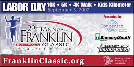 Get ready to run, walk or cheer at the 29th Annual Franklin Classic on Monday, September 3, presented by BancorpSouth, Concentra Network Services and Darrel Waltrip Honda Volvo. This race is the “second largest race in Middle Tennessee” said Race Director, Kortland Fuqua, and is a great way to help support Mercy Children’s Clinic. “Mercy Children’s Clinic, is a Franklin-based non-profit organization that provides primary pediatric healthcare to children from all socio-economic backgrounds including children without health insurance or enrolled in TennCare.”