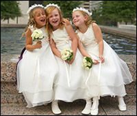 For 2007, the flower girls will still match the bride in color but in a softer style, one more befitting their age. Layers of chiffon accented with flower petals or pretty ribbons in the color of the bridesmaids’ gowns are the looks for today.
